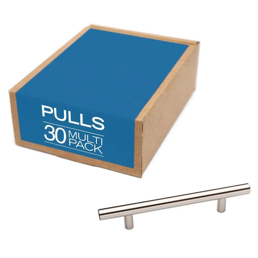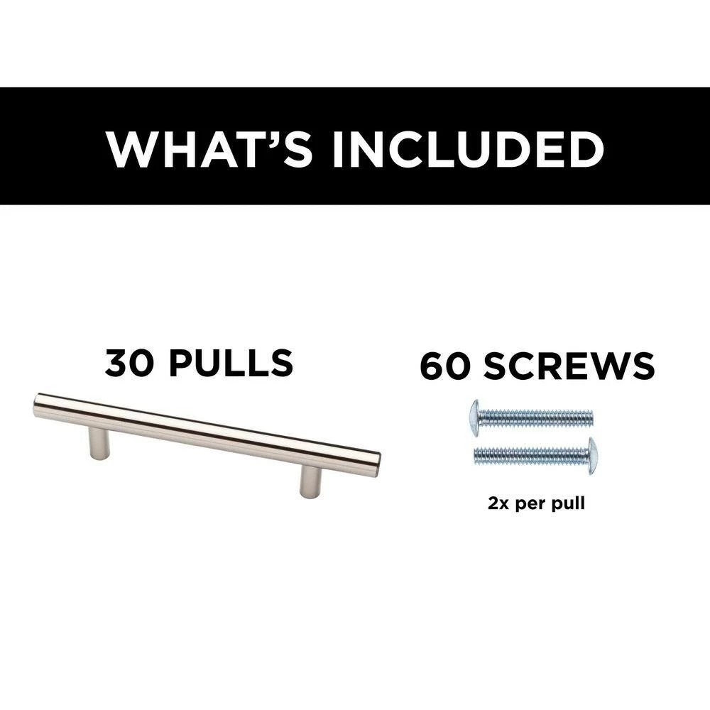 Simple is beautiful. Put the finishing touch on a room or entire home quickly with beautiful furniture handles that can go from the kitchen to the bedroom effortlessly. As a kitchen cabinet handle or a drawer pull, this lustrous silver cabinet pull is a lean and smooth cabinet hardware standout. The Simple Bar handle in stainless steel finish features rounded edges with a 5-1/16 in. center-to-center, offering a comfortable grip on your cabinets and drawers. We offer modern trends, priced right for you. Made for you by Franklin Brass – with over 70-years in cabinet hardware – this line of modern pulls gives you pride in your home at a practical price. This 30-pack of silver cabinet handles is a fantastic value to upgrade your kitchen cabinets or other furniture hardware needs.