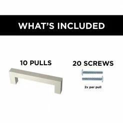 Simple is beautiful. Put the finishing touch on a room or entire home quickly with beautiful furniture handles that can go from the kitchen to the bedroom effortlessly. As a kitchen cabinet handle or a drawer pull, this lustrous silver cabinet pull is a lean and smooth cabinet hardware standout. The Simple Modern Square handle in stainless steel finish features square edges with a 3-3/4 in. center-to-center, offering a comfortable grip on your cabinets and drawers. We offer modern trends, priced right for you. Made for you by Franklin Brass – with over 70-years in cabinet hardware – this line of modern pulls gives you pride in your home at a practical price. This 10-pack of silver cabinet handles is a fantastic value to upgrade your kitchen cabinets or other furniture hardware needs.