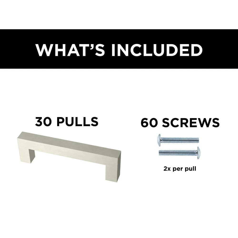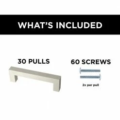 Simple is beautiful. Put the finishing touch on a room or entire home quickly with beautiful furniture handles that can go from the kitchen to the bedroom effortlessly. As a kitchen cabinet handle or a drawer pull, this lustrous silver cabinet pull is a lean and smooth cabinet hardware standout. The Simple Modern Square handle in stainless steel finish features square edges with a 3-3/4 in. center-to-center, offering a comfortable grip on your cabinets and drawers. We offer modern trends, priced right for you. Made for you by Franklin Brass – with over 70-years in cabinet hardware – this line of modern pulls gives you pride in your home at a practical price. This 30-pack of silver cabinet handles is a fantastic value to upgrade your kitchen cabinets or other furniture hardware needs.