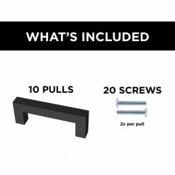 Simple is beautiful. Put the finishing touch on a room or entire home quickly with beautiful furniture handles that can go from the kitchen to the bedroom effortlessly. As a kitchen cabinet handle or a drawer pull, the Simple Modern Square black cabinet pull is the sophisticated cabinet hardware to complete your decor. This black pull features square edges with a 3 in. center-to-center, offering a comfortable grip on your cabinets and drawers. We offer modern trends, priced right for you. Made by Franklin Brass with over 70-years in cabinet hardware, this line of modern pulls gives you quality at a practical price. This 10-pack of black cabinet handles is a fantastic value to upgrade your kitchen cabinets or other furniture hardware needs.