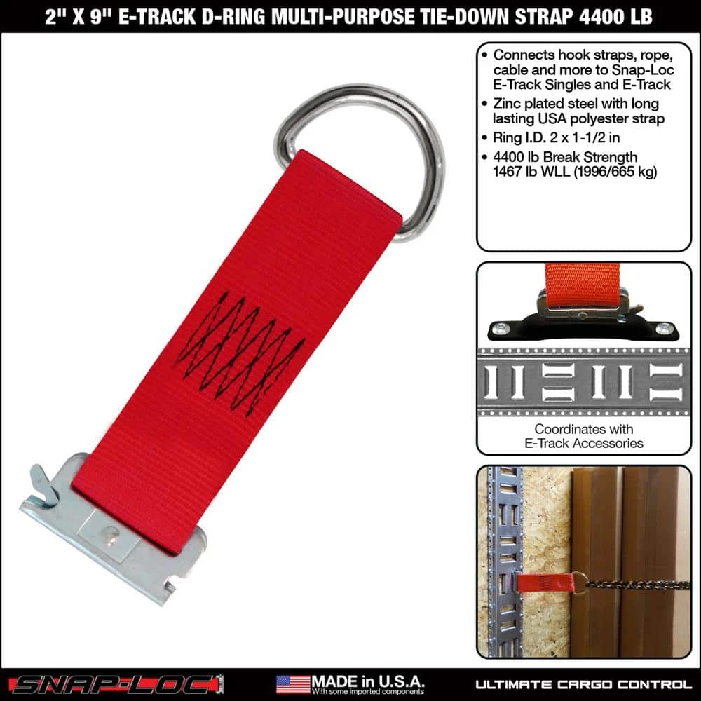 - Fits E-Track and “Snap-Loc E-Track Singles” for the fastest, safest and easiest way to strap down cargo on trucks, trailers, racks, walls, ceilings, floors and more!