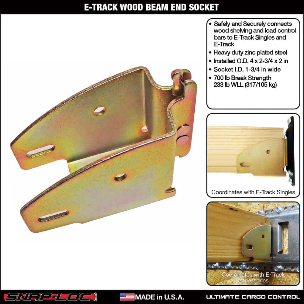 Snap-Loc E-Track Wood Beam End Socket connects wood stud beams and more to “Snap-Loc E-Track Singles” and E-Track! You’re going to love coordinating this item with “Snap-Loc E-Track Singles” the perfect solution for moving everything faster, safer and easier! The Snap-Loc E-Track System also coordinates with the Snap-Loc E-Track Dolly to “Safely Moves More in Less Time” with easy rolling casters and tie-down strap attachment for securing cargo! Only “The Snap-Loc System” offers a permanent comprehensive solution for all your cargo management needs!