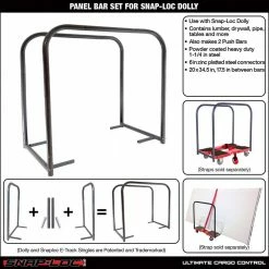 Panel Bar Set transforms the Snap-Loc Dolly System into a Panel Cart for easier moving/containment of lumber, drywall, pipe, tables and more! The Snap-Loc Dolly System is the easiest, fastest and safest way to move more in less time! THE PROBLEM: Cheap dollies have junky casters that don’t roll well, break often causing valuable items to dangerously fall and waste your time and money. THE SOLUTION: The Snap-Loc Dolly has high capacity smooth rolling casters, is USA made to last a lifetime, offers E-Track Strap cargo anchoring with Push-Panel Bars that transform to move everything with ease! You’re going to love it! Dolly System also coordinates with the Snap-Loc E-Track Single System to secure cargo and items on pickups, trucks, trailers, racks, walls, floors, ceilings and more!